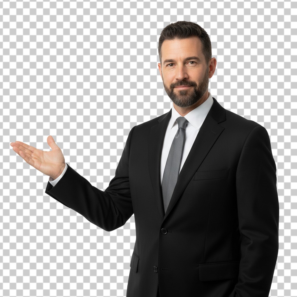 Businessman in formal black suit pointing to the side PNG Transparent Background,Business People,Professionals