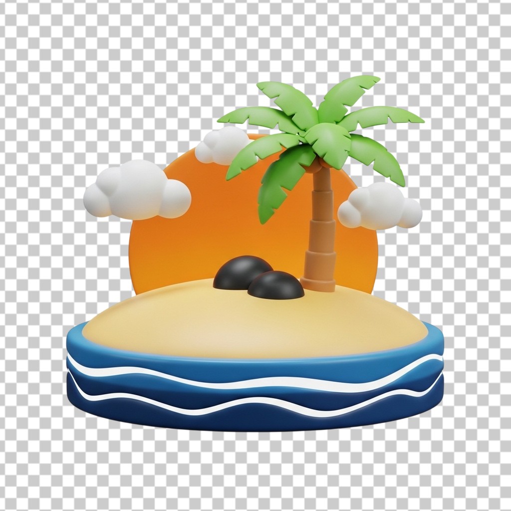3D Tropical Island with Palm Tree and Ocean Waves Illustration PNG Transparent Background