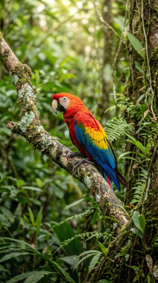 Colorful Scarlet Macaw Parrot Perched in the Rainforest