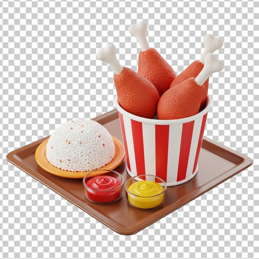 3D Crispy Fried Chicken Bucket with Rice Tray PNG Transparent Background