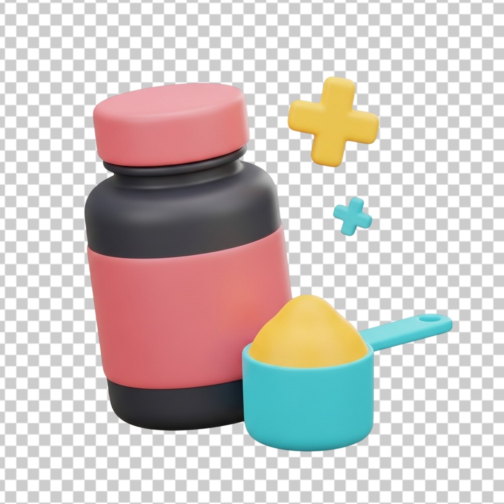 Pink Protein Supplement Jar with Scoop 3D Illustration PNG Transparent Background