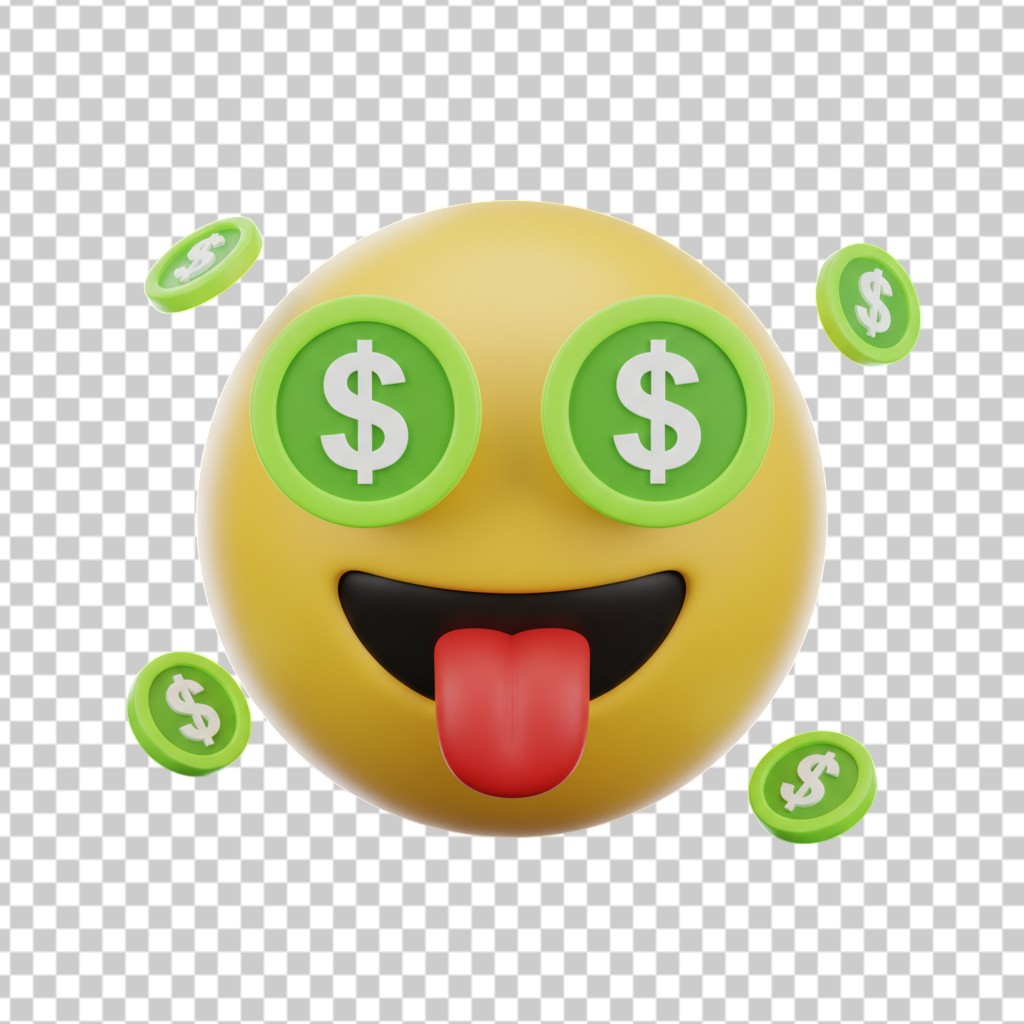 Rich Money Mouth 3D Emoji with Dollar Signs and Floating Gold Coins PNG Transparent Background