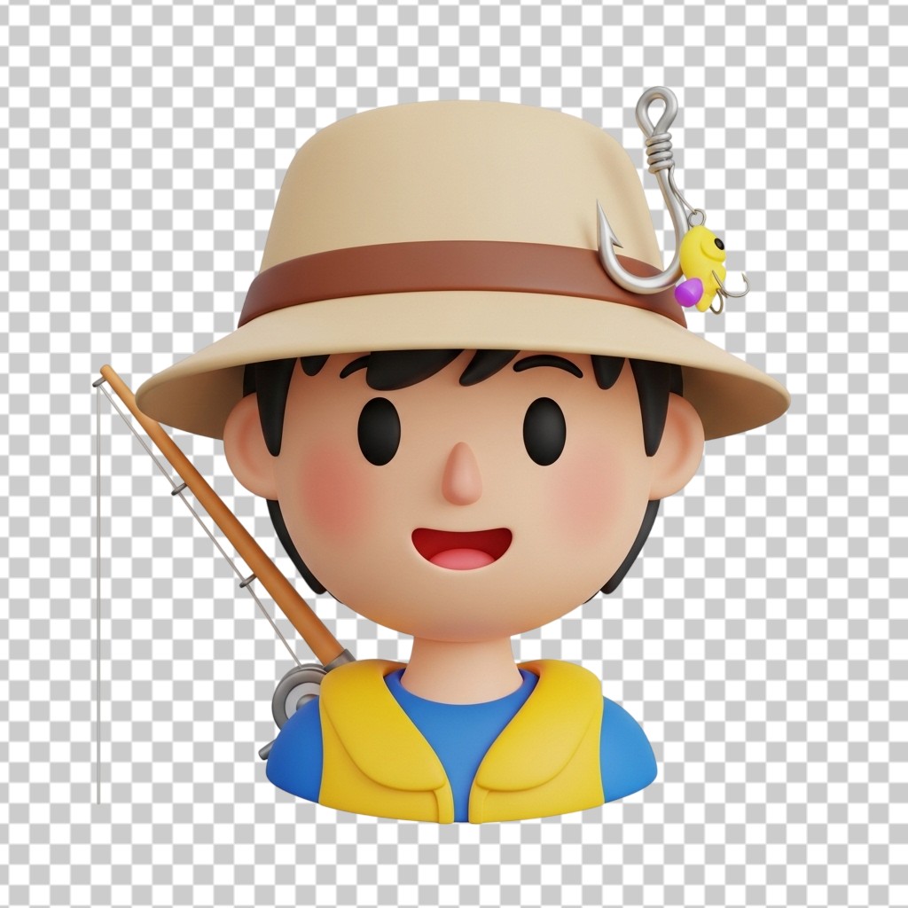 3D Cartoon Fisherman Character with Hat and Rod PNG Transparent Background
