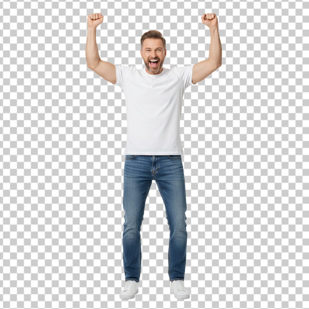 Happy Young Man in White T-shirt and Jeans Celebrating with Both Arms Raised PNG Transparent Background