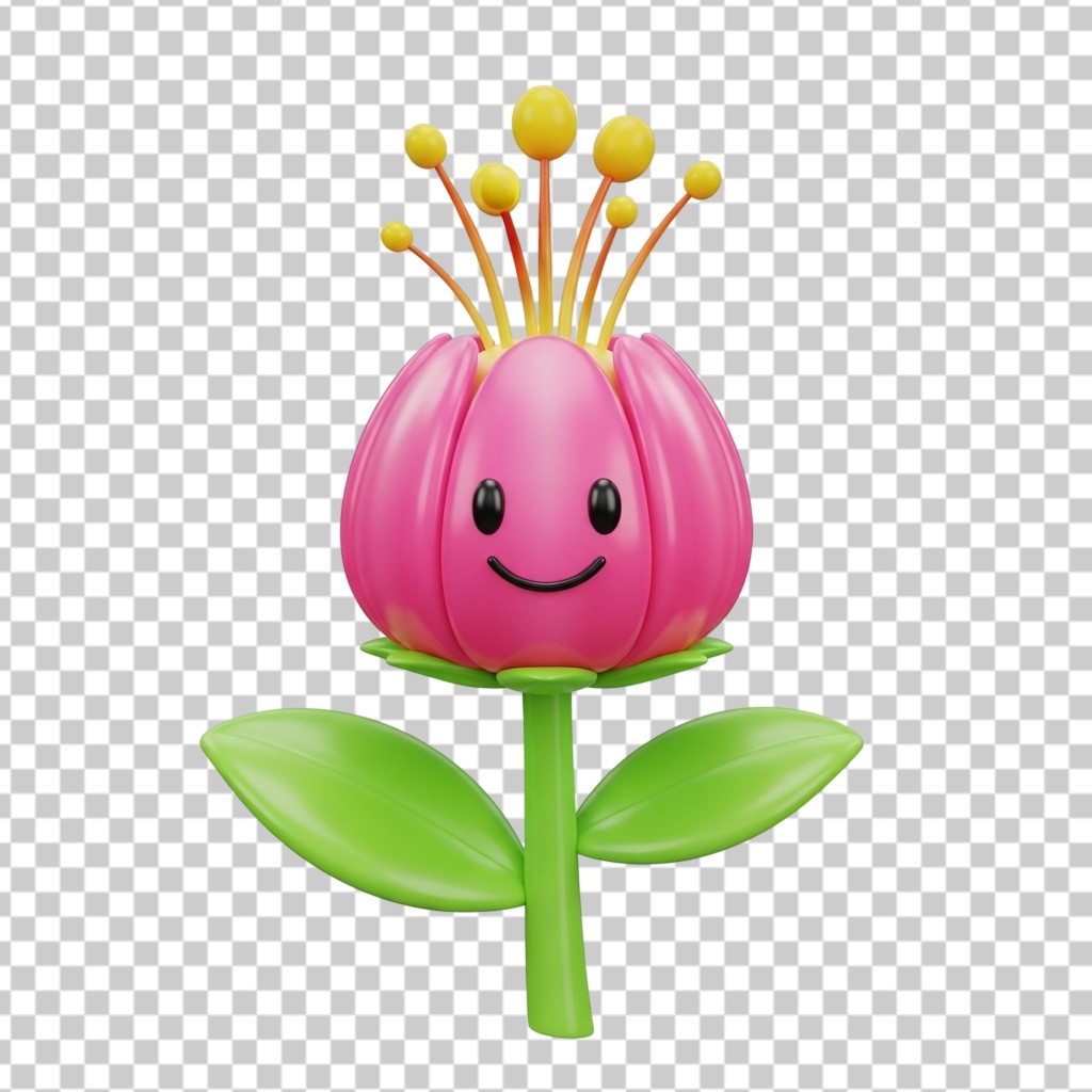 Cute 3D Pink Flower Character with Smiling Face PNG Transparent Background