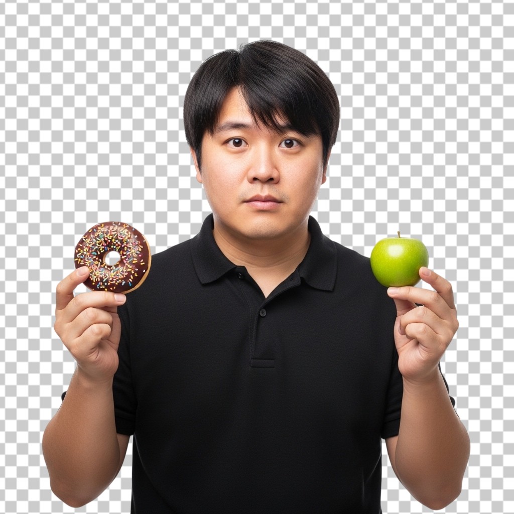 Man Holding a Healthy Green Apple and a Chocolate Donut for Choice PNG Transparent Background