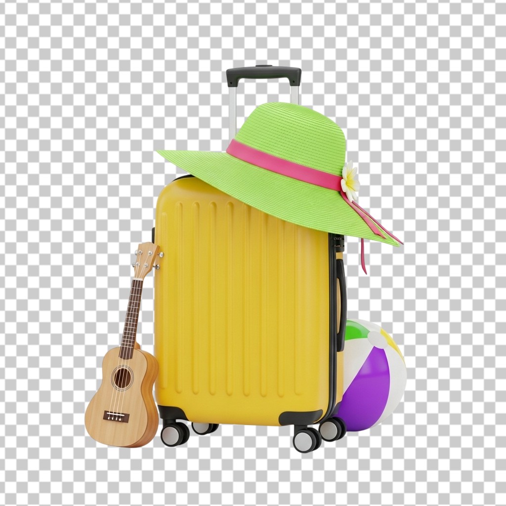 3D Yellow Travel Suitcase with Guitar and Summer Hat PNG Transparent Background