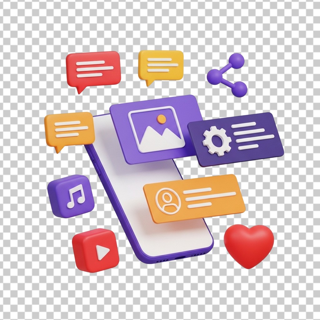 Floating 3D Social Media Icons and UI Elements PNG Transparent Background
