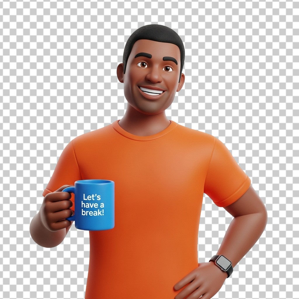 3D Smiling Black Man Character Holding Coffee Mug PNG Transparent Background