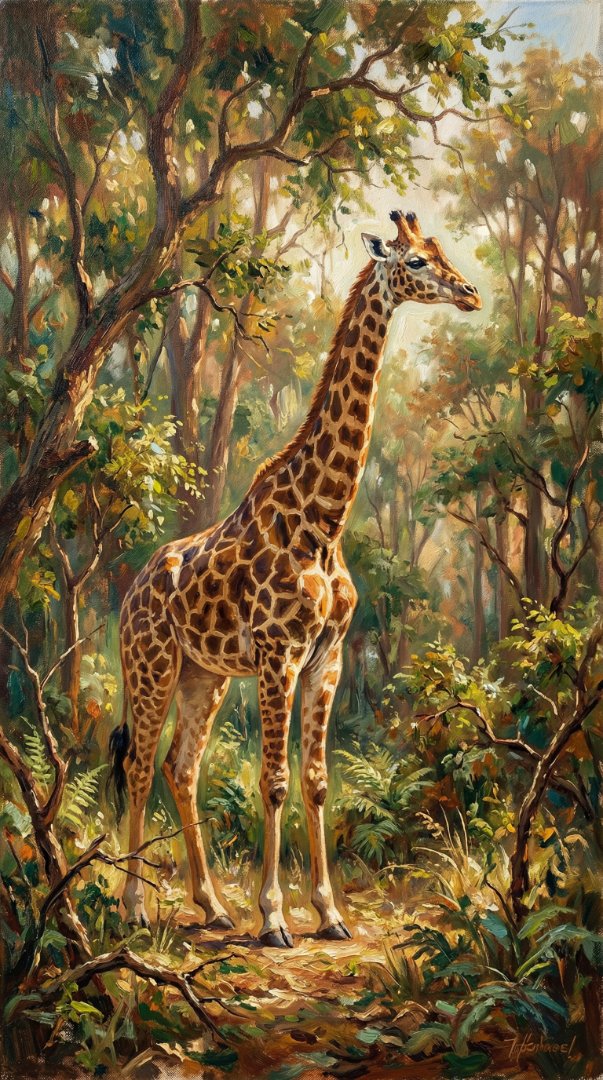 An artistic illustration featuring a tall giraffe standing amidst lush vegetation and warm forest lighting.