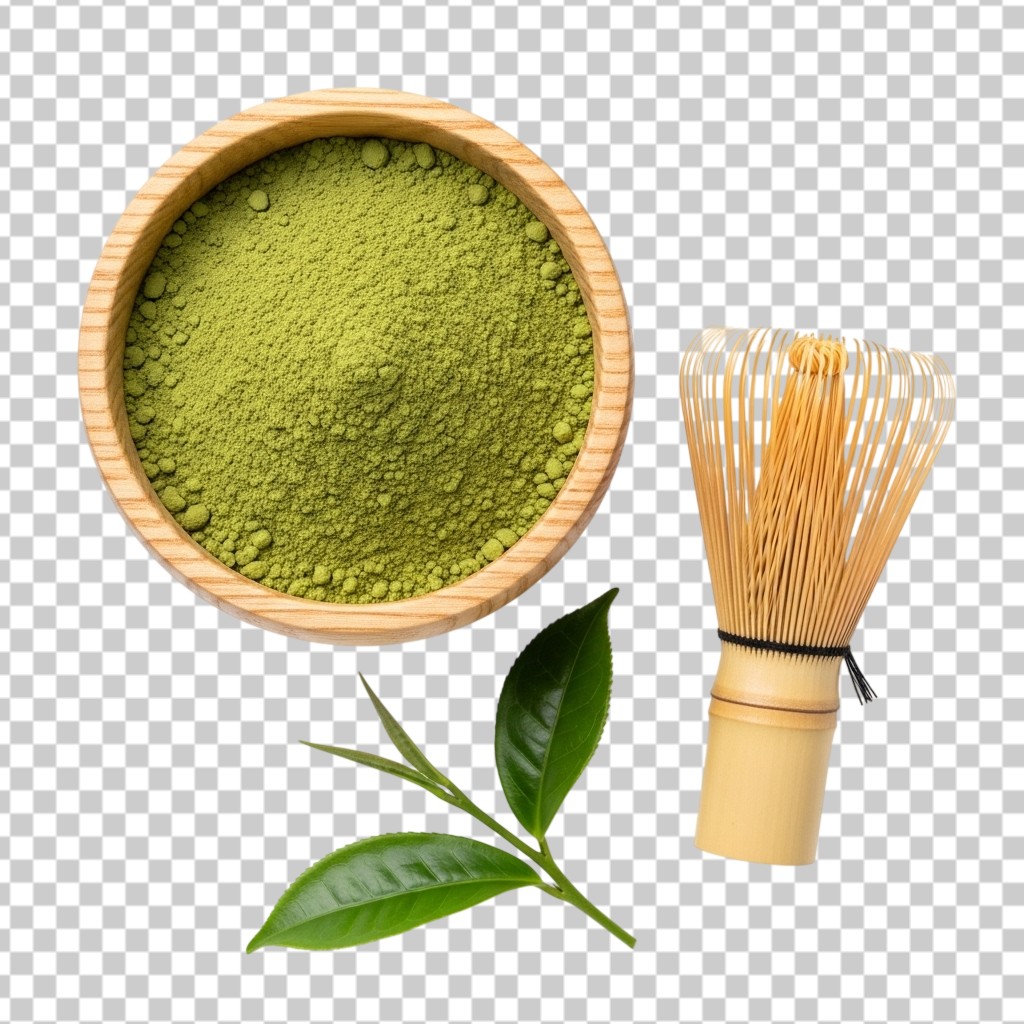 Matcha Green Tea Powder with Bamboo Whisk PNG Transparent Background