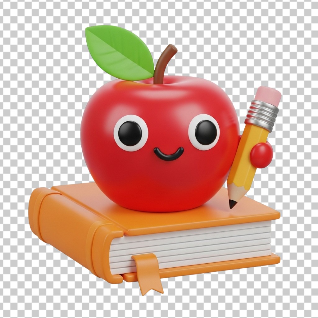 3D Red Apple Character Sitting on School Books PNG Transparent Background