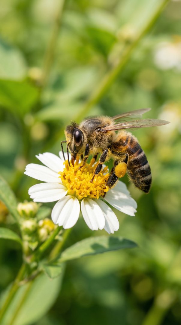 A high-resolution macro image of a honey bee at work resting on the bright yellow center of a daisy.