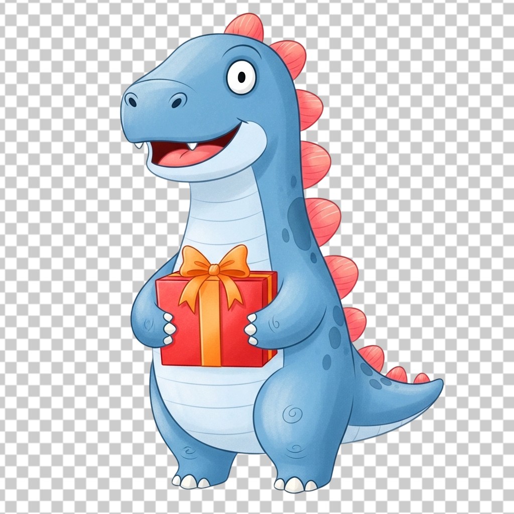 Cute Blue Cartoon Dinosaur Holding a Gift Box PNG Transparent Background