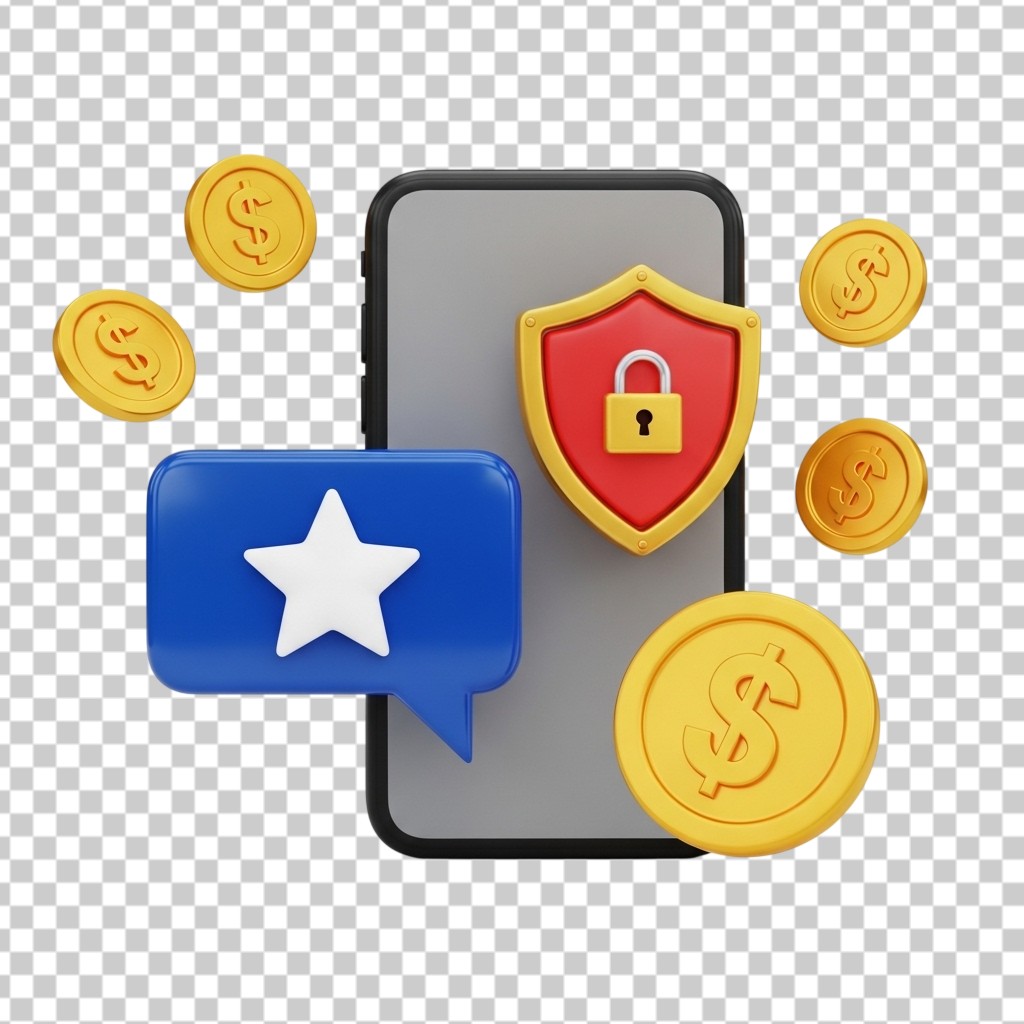3D Finance and Security Icons Set with Mobile Phone and Gold Coins PNG Transparent Background
