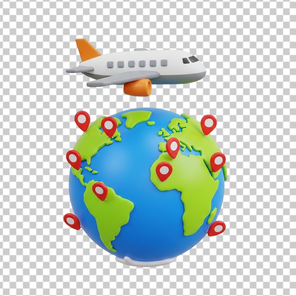 3D Airplane Flying Over Earth Globe with Map Pins PNG Transparent Background