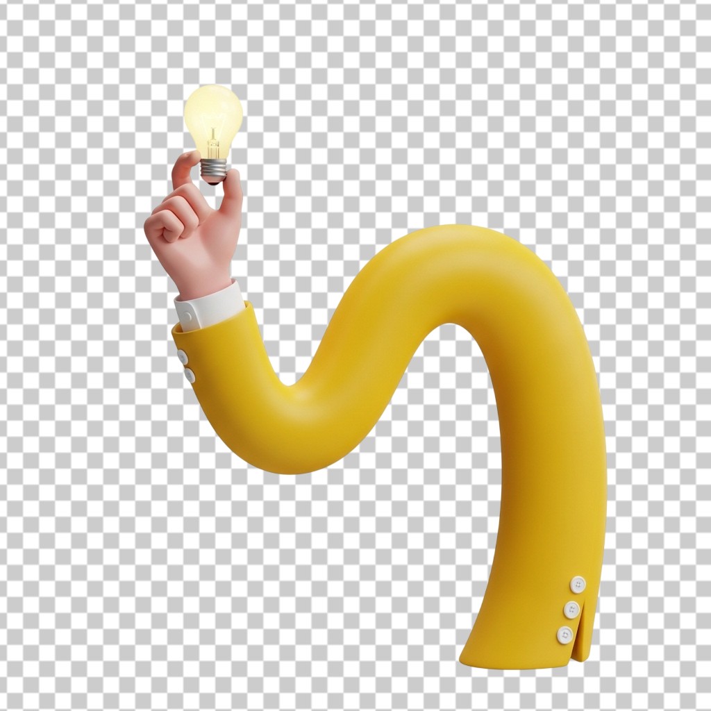 3D Long Flexible Arm Hand Holding a Bright Idea Light Bulb PNG Transparent Background