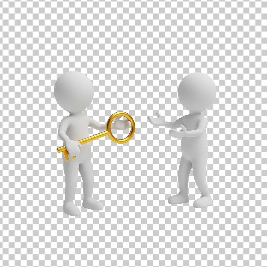 Two 3D Small Persons Shaking Hands and Holding a Key PNG Transparent Background