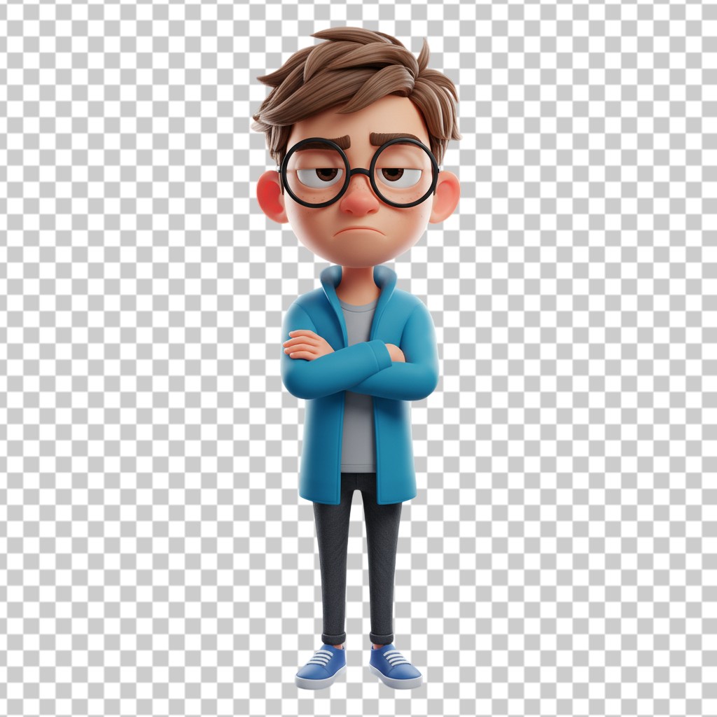 Grumpy Nerd Boy with Glasses 3D Character PNG Transparent Background