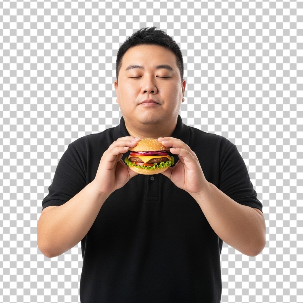Man Enjoying a Large Burger with Eyes Closed PNG Transparent Background