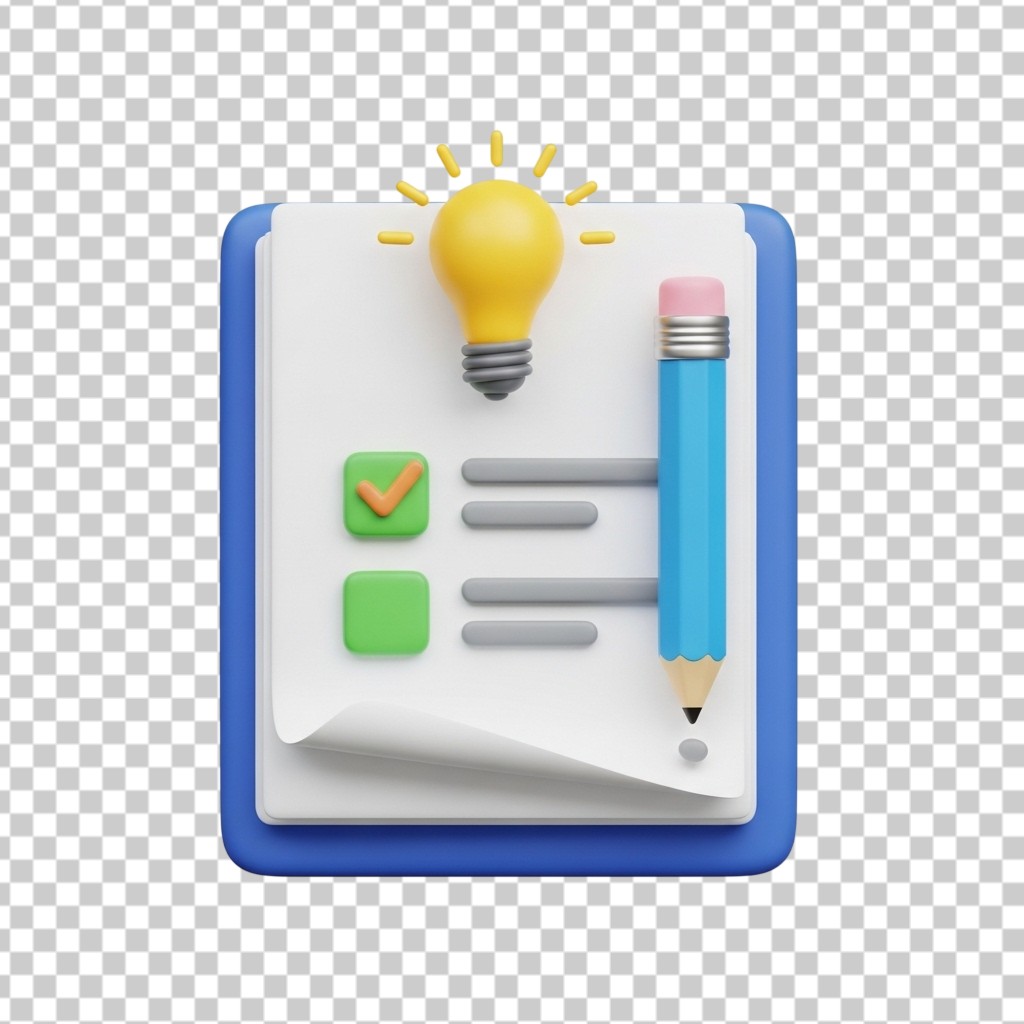 3D Business Checklist Clipboard with Lightbulb and Pencil PNG Transparent Background