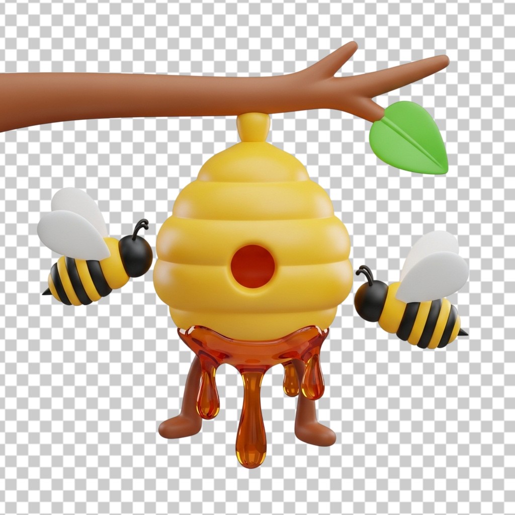 3D Cartoon Beehive Hanging from Tree Branch with Bees PNG Transparent Background