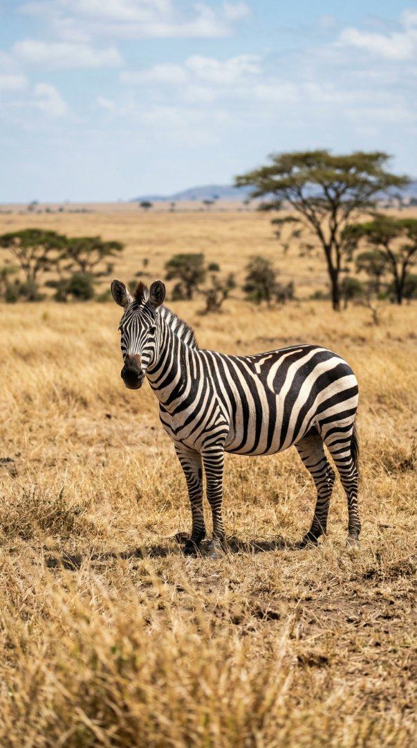 A full-body shot of a beautiful wild zebra standing proudly in a wide open safari landscape.