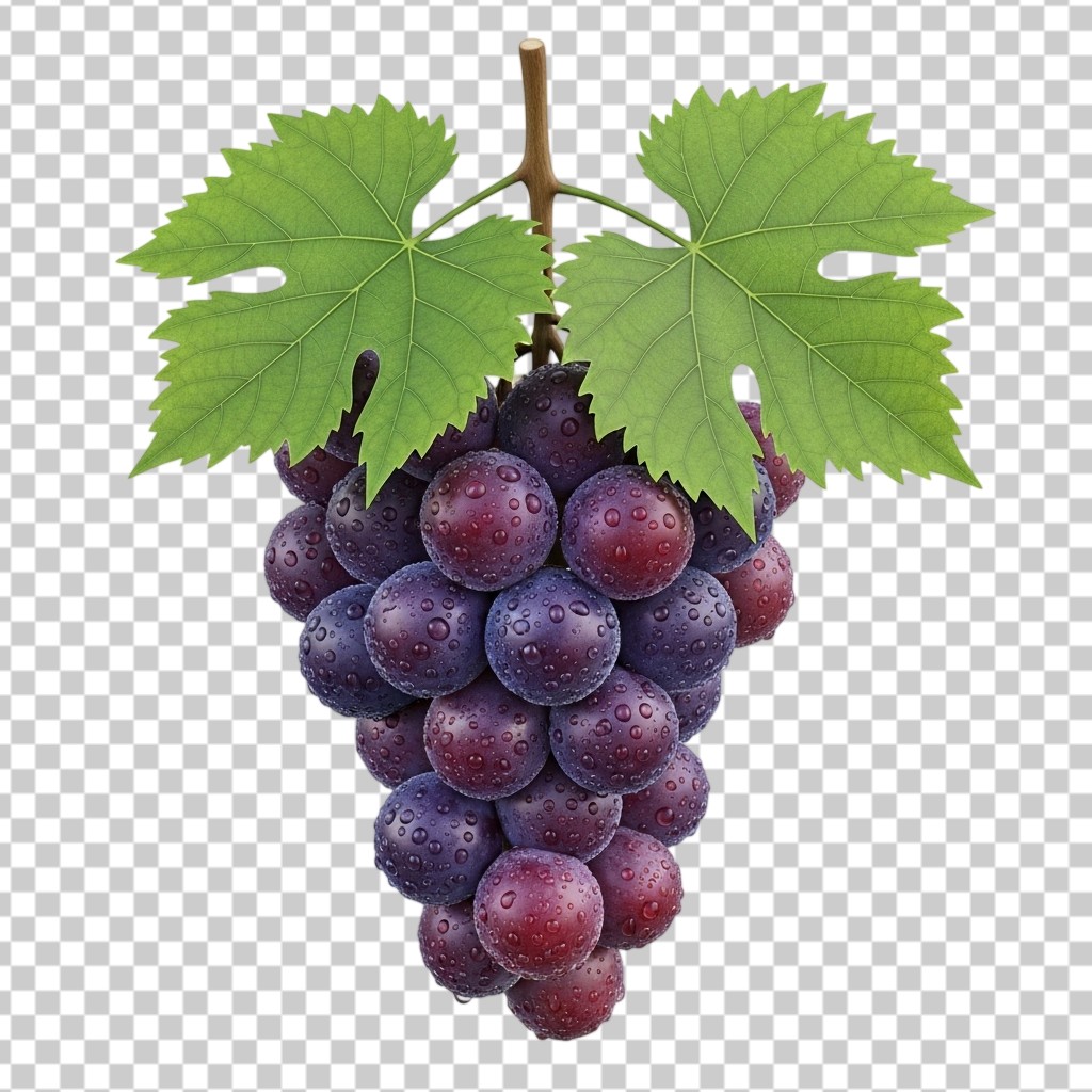Fresh Bunch of Purple Grapes with Green Leaves and Water Drops PNG Transparent Background