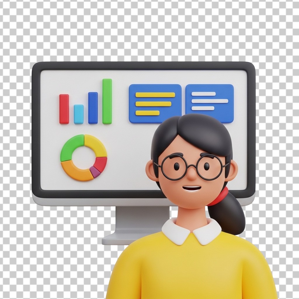 Female Data Analyst Character with Computer Monitor and Charts 3D PNG Transparent Background