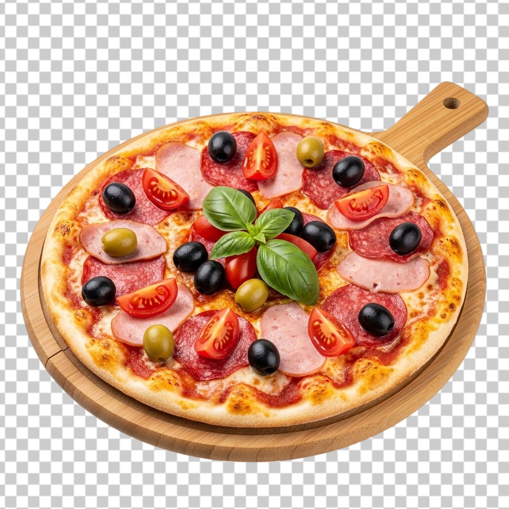 Full Pizza with Pepperoni Olives and Basil on Board PNG Transparent Background