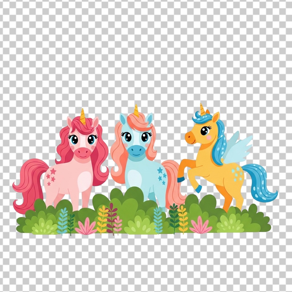Three Cute Colorful Little Unicorn Characters PNG Transparent Background