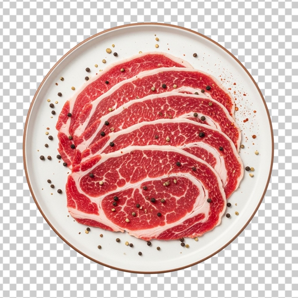 Fresh Slices of Marbled Red Beef Meat on a Plate PNG Transparent Background