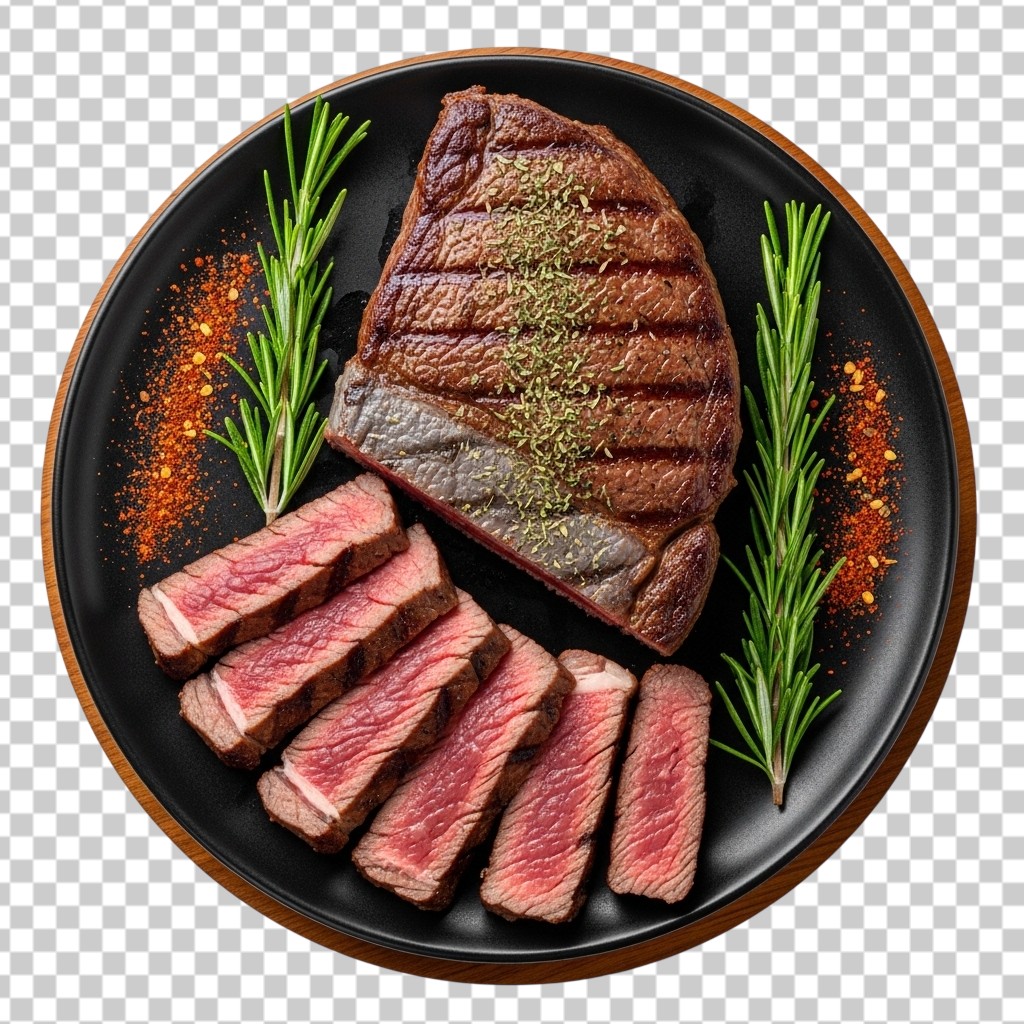 Premium Grilled Beef Steak with Sliced Portions Served with Rosemary and Spices PNG Transparent Background
