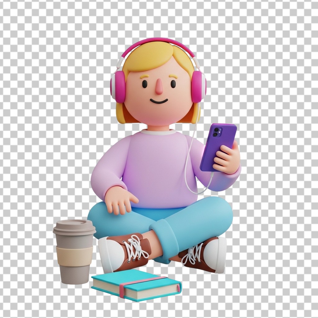 3D Girl Character Studying with Headphones and Books PNG Transparent Background