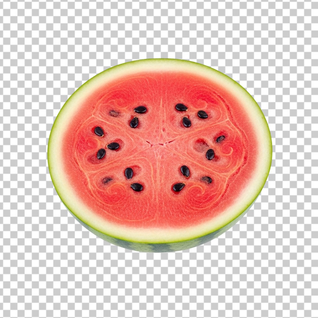 Half Slice of Fresh Juicy Red Watermelon with Black Seeds PNG Transparent Background