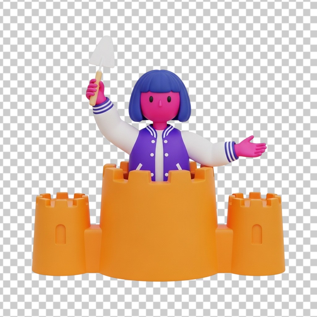 3D Girl Character Building a Sandcastle Illustration PNG Transparent Background