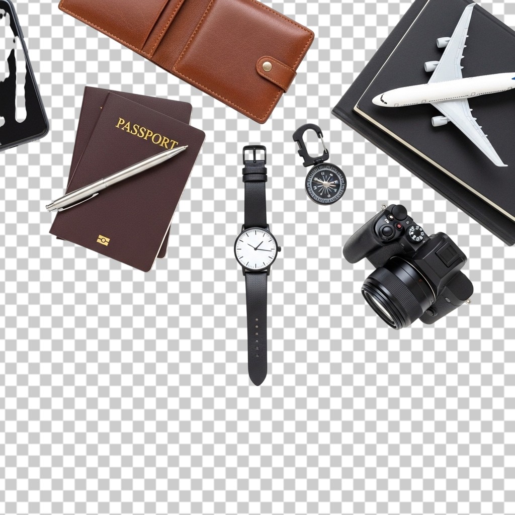 Travel Essentials Flat Lay with Passport Camera and Watch PNG Transparent Background