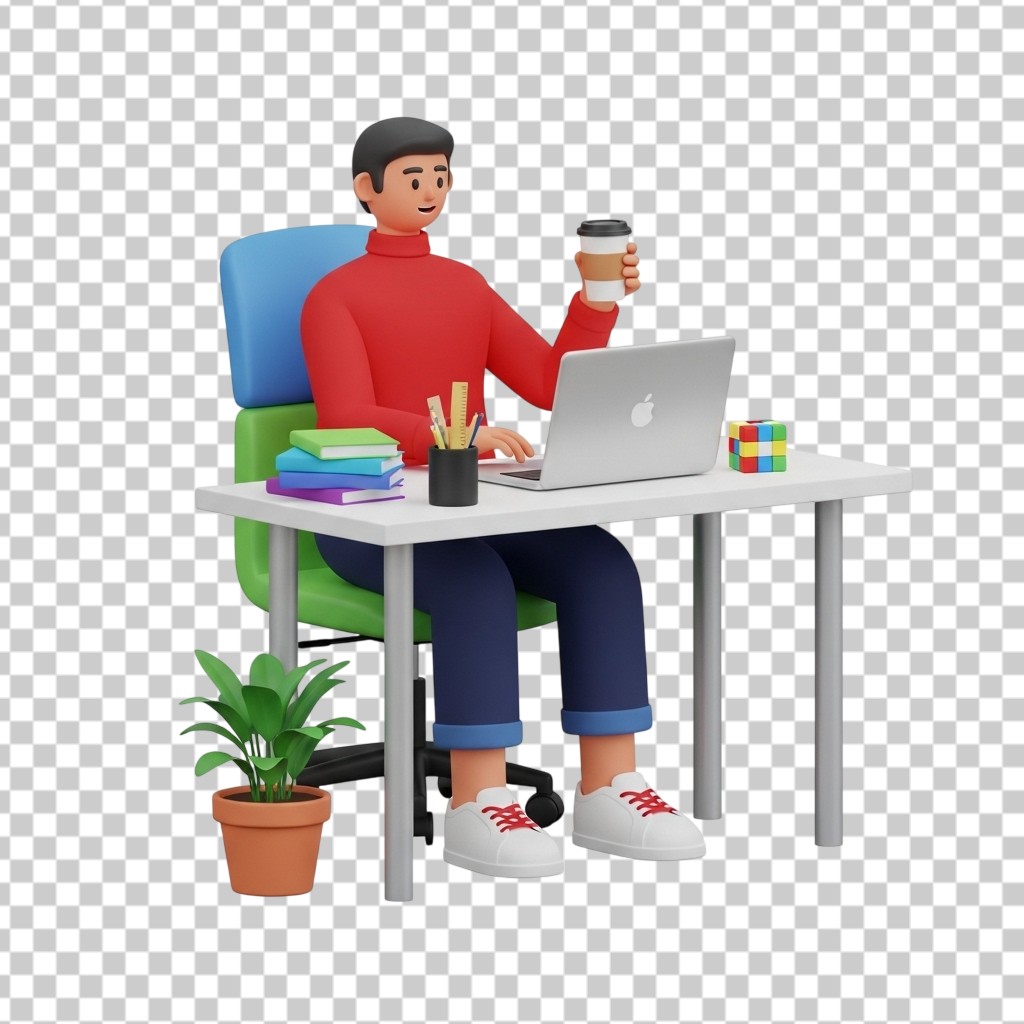 3D Character of a Professional Working on Laptop at Office Desk PNG Transparent Background