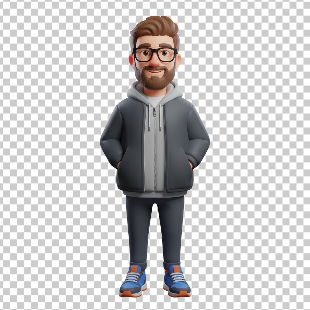 3D Cartoon Stylish Man Wearing Grey Hoodie and Glasses PNG Transparent Background,3D