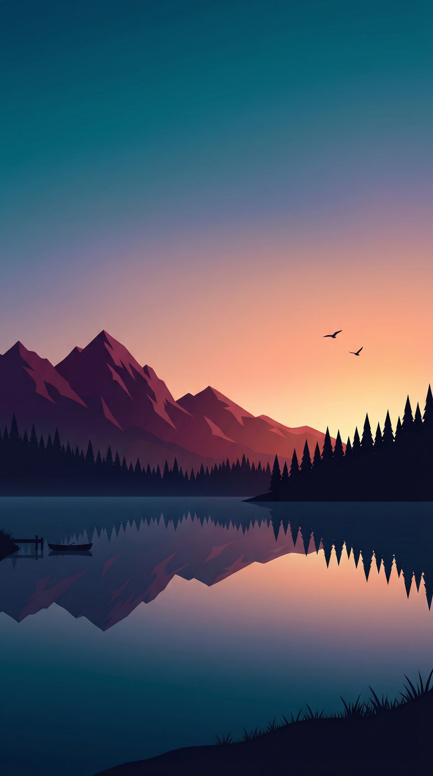 A beautiful landscape illustration featuring purple mountains and pine trees reflected in a still lake at dusk. Perfect for serene nature backgrounds