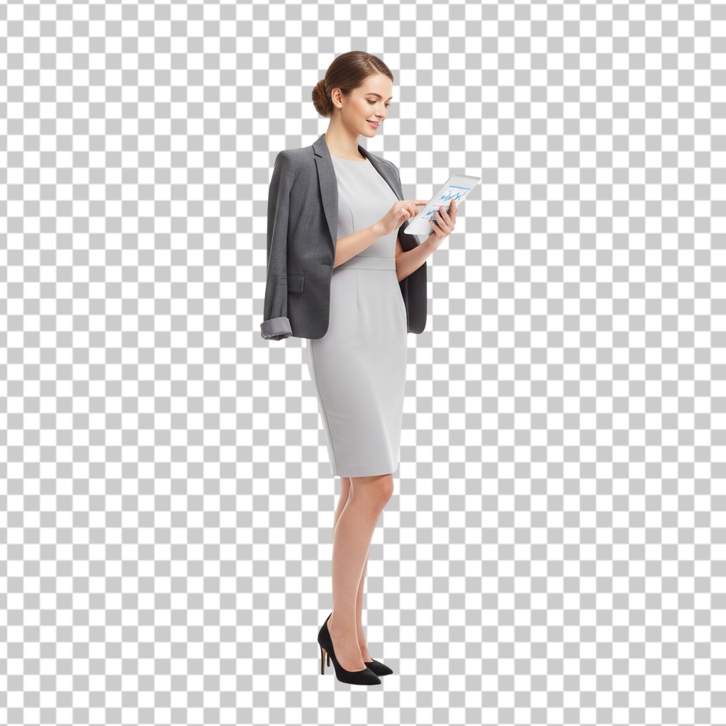 Elegant Business Woman in Grey Suit Using Digital Tablet PNG Transparent Background,People