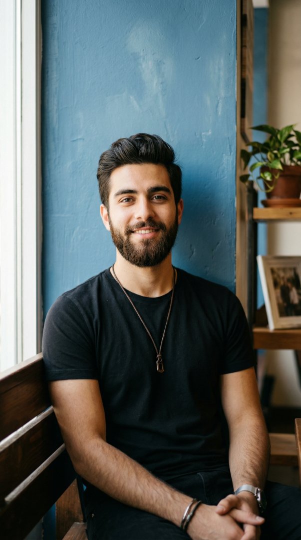 A friendly casual portrait of an attractive male subject sitting calmly in a cozy cafe or living space.