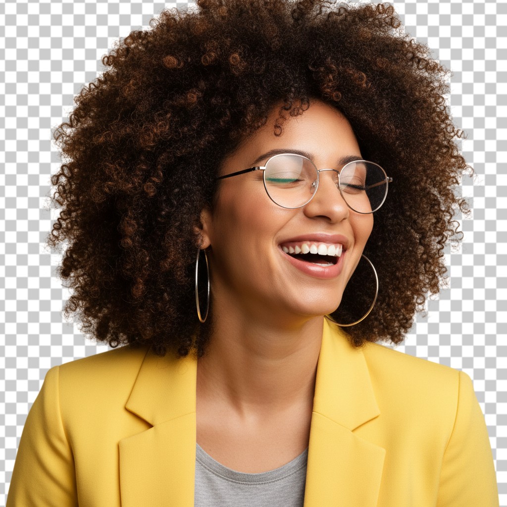 Businesswoman with curly hair laughing in yellow blazer PNG Transparent Background,Business People,Professionals