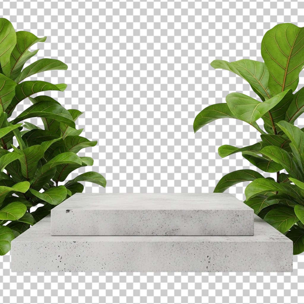 Modern Stone Display Podium Stand with Large Tropical Green Leaves PNG Transparent Background