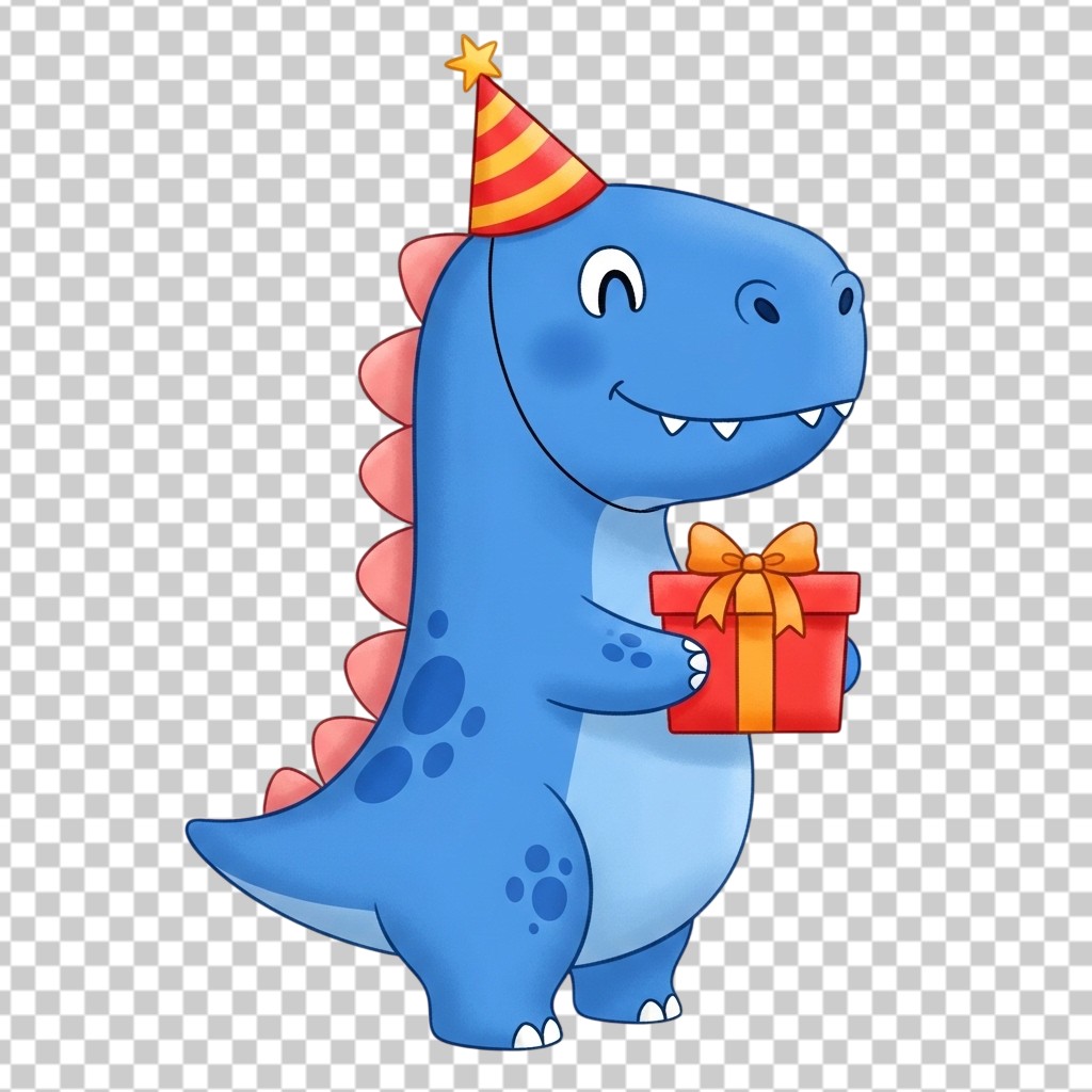 Cute Blue Dinosaur with Party Hat and Gift PNG Transparent Background