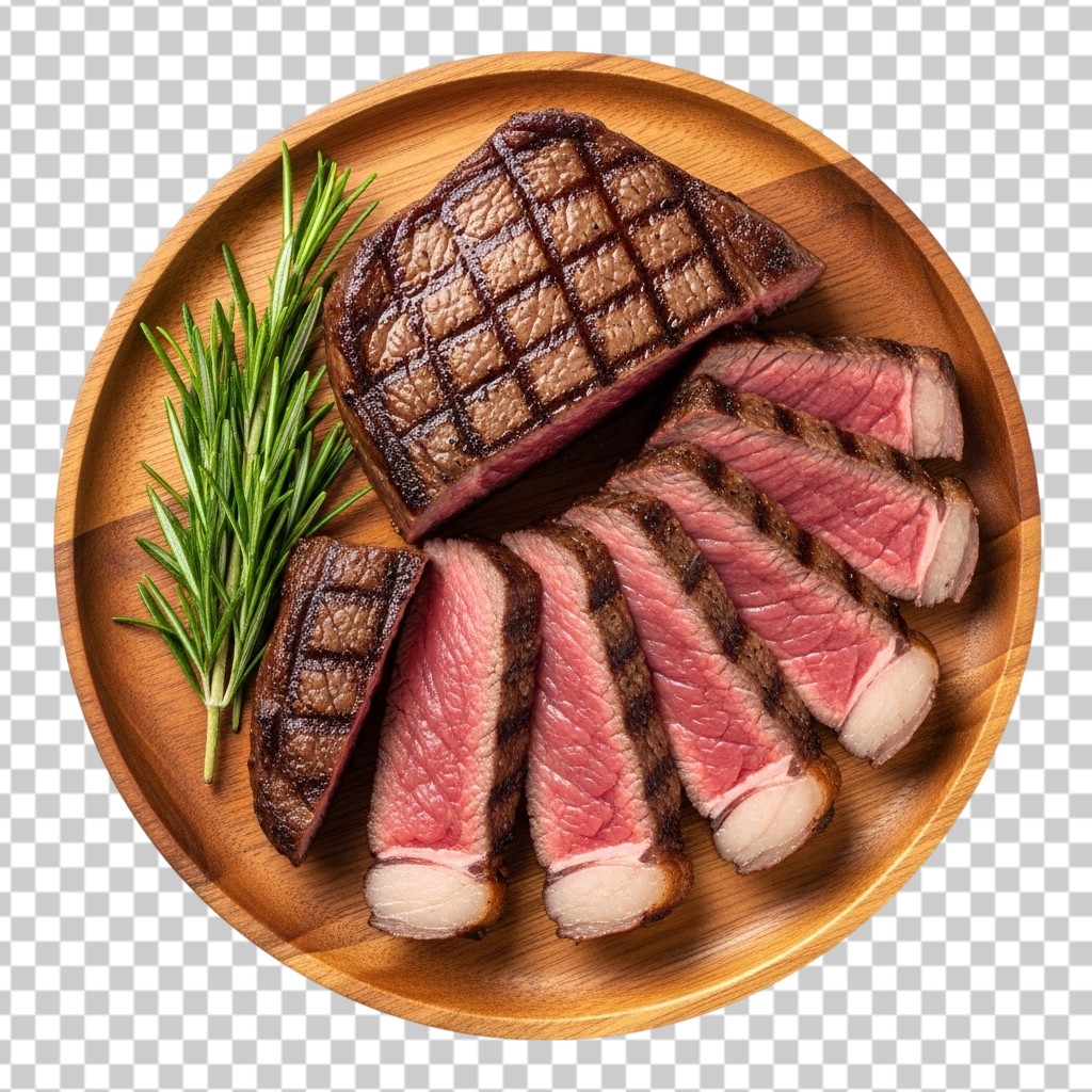 Sliced Perfectly Cooked Medium Rare Ribeye Steak on a Wooden Board PNG Transparent Background