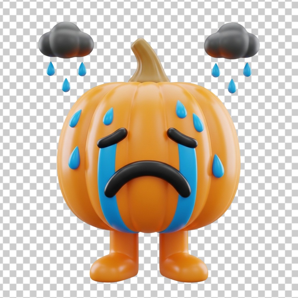 Sad 3D Pumpkin Character with Rain and Storm Clouds PNG Transparent Background