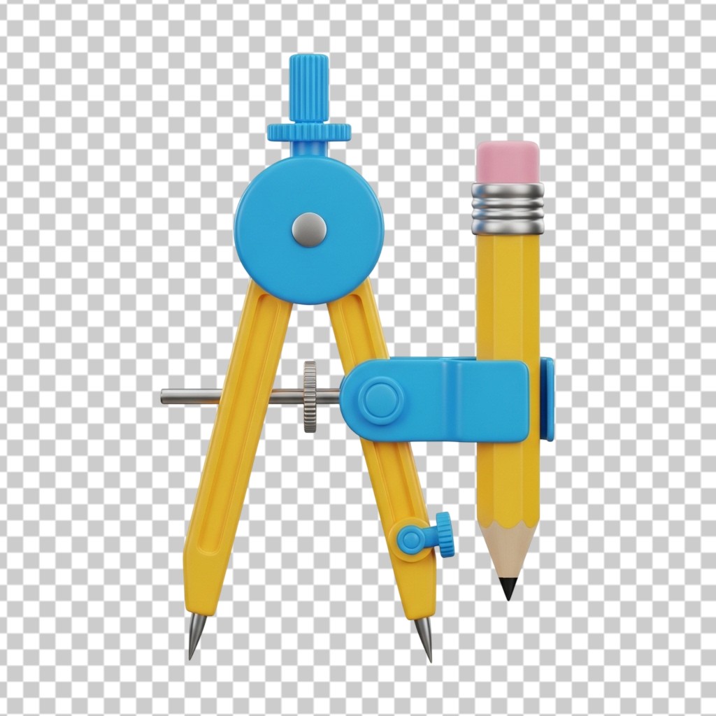 3D Blue Geometry Compass and Yellow Pencil Drawing Tools PNG Transparent Background