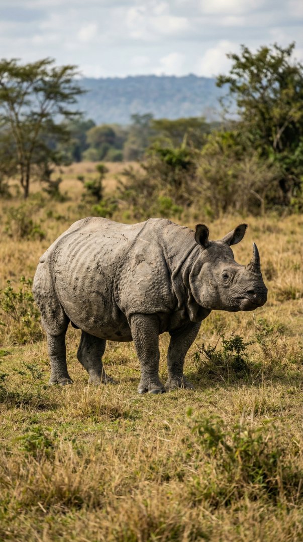 A powerful image of a large grey rhino with a prominent horn roaming the grassy plains of Africa.