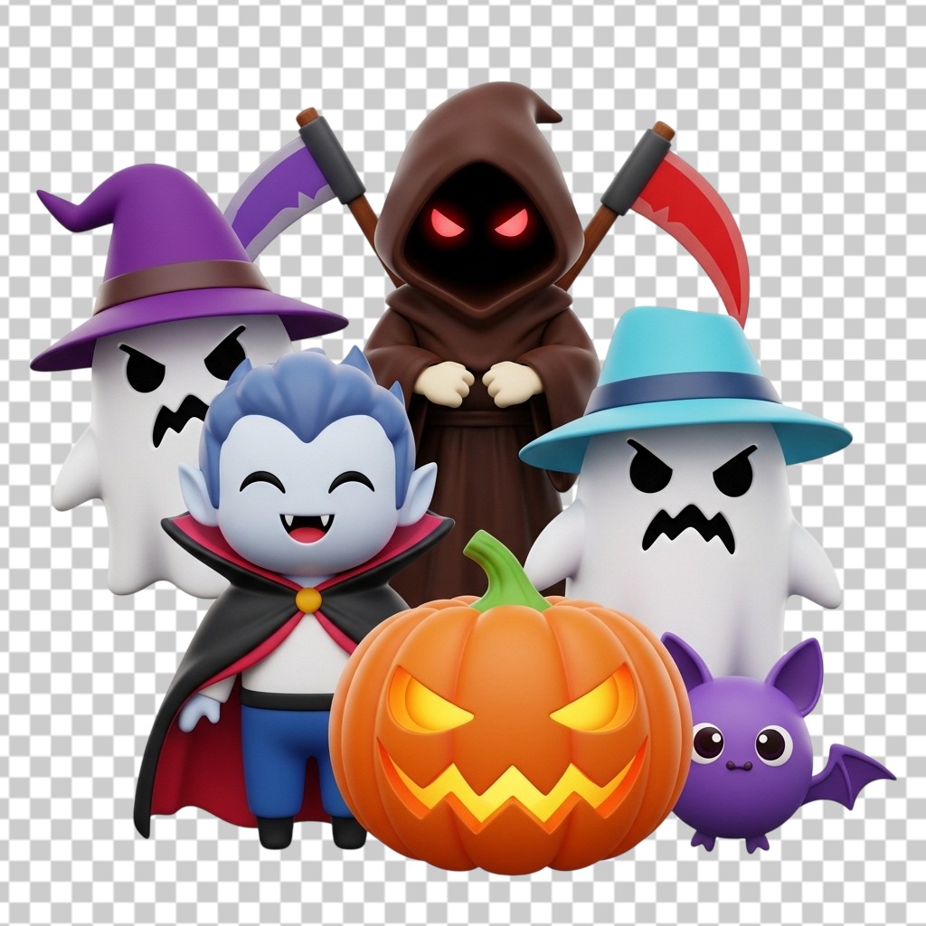 Group of Cute 3D Halloween Characters Including Vampire Ghost and Pumpkin PNG Transparent Background